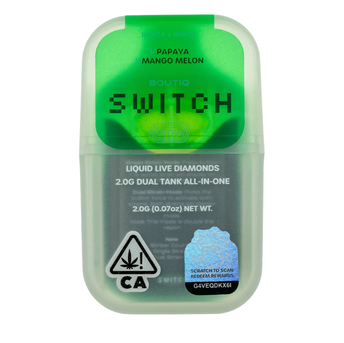 Drift into tropical relaxation with the Boutique Switch Glow 2g Dual Tank Disposable, a juicy combo of Papaya and Mango Melon — two indica-dominant strains known for their deeply calming effects and exotic fruit-forward flavor. Enhanced with Liquid Live Diamonds, this dual-tank vape delivers potent, terpene-rich clouds wrapped in a sleek glow-in-the-dark design that shines in any setting. Perfect for evening use, this blend brings soothing body effects and a mellow mind, ideal for winding down or enhancing your chill routine. • Strains: Papaya (Indica) + Mango Melon (Indica) • 2.0g Dual Tank Vape – 1g per chamber • Liquid Live Diamonds – Pure, high-potency extract with full flavor • Glow-in-the-Dark Finish – Night-ready and easy to find • Dual Mode Function – Switch strains on demand • USB-C Rechargeable – Long-lasting and portable • Solvent-Free & Lab-Tested – Clean, smooth draws every time Let Papaya x Mango Melon wrap you in flavor, relaxation, and style — a true nighttime staple in the Glow series.
