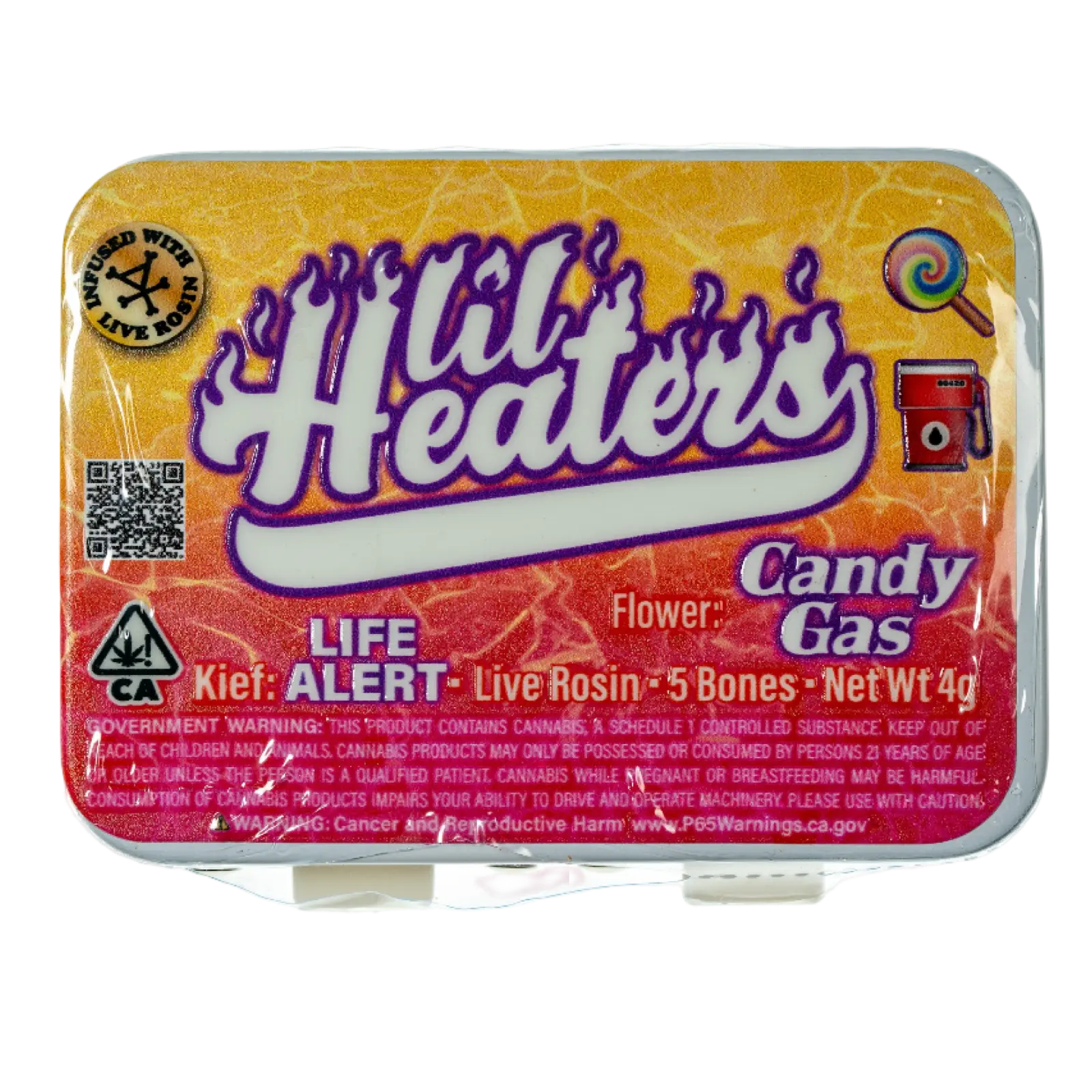 Sweet meets savage with Lil Heaters: Candy Gas — a sugar-coated slap to the senses. This 5-pack of mini “bones” blends Candy Gas flower with a powerful infusion of Life Alert kief and solventless live rosin, delivering mouthwatering flavor and heavy-hitting effects. Expect a bold candy sweetness up front, chased by fuel-soaked exhale and euphoric elevation. Strain: Candy Gas Infused With: Solventless Live Rosin Kief: Life Alert Count: 5 Pre-Rolls (“Bones”) Weight: 4 grams (net wt.) Flavor Profile: Fruity candy, sugary diesel Effects: Uplifting, creative, smooth body buzz 🍬 Engineered for flavor fiends who like their smoke sweet but strong.